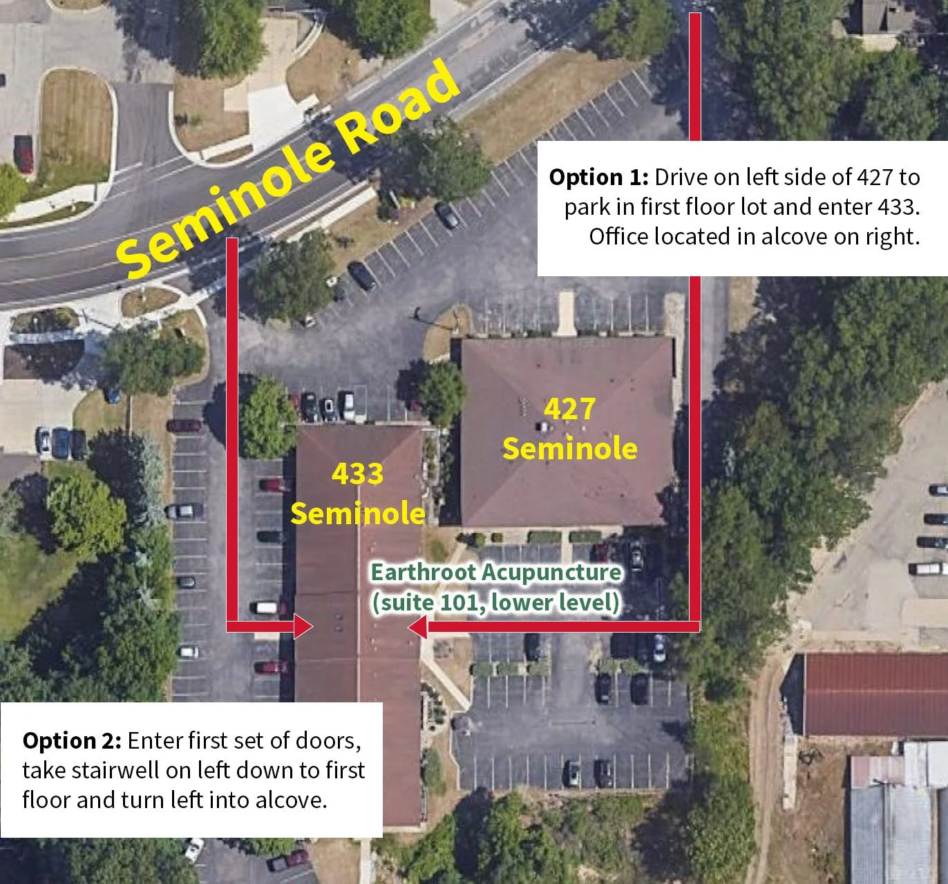 We are located at 433 Seminole Road, which is just east of Seaway (BUS-31). Our healing space is nestled away in a quiet corner of the building. There are two parking options available. Option 1 behind 427 Seminole is preferred as it will take you right to first floor and is handicap accessible.